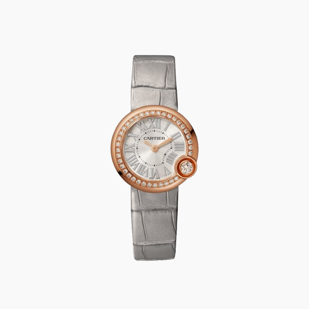 Ballon Blanc de Cartier watch, 26 mm, quartz movement. 18K rose gold case set with brilliant-cut diamonds. Brilliant-cut diamond at 4 o'clock. Silvered sunray-brushed dial. Golden-finish sword-shaped hands. Sapphire crystal. Semi-matte light gray alligator-skin strap, ardillon buckle in 18K rose gold. Case thickness: 7.85 mm. Water-resistant to 3 bar (approx. 30 meters).