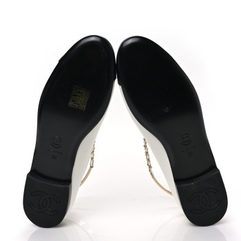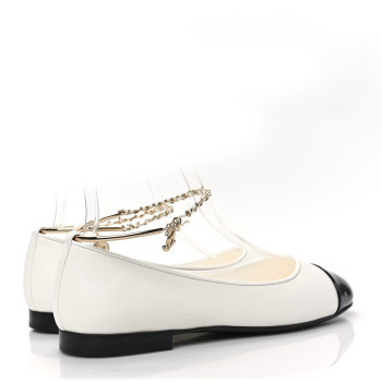 Here is a pair of Genuine Chanel Nappa Patent Calfskin Toe Ankle Chain Ballerina Flats, These classic flats are crafted in white lambskin. These flats feature a black patent leather hijab, leather and chain braided crossover straps and a dangling gold camellia charm.