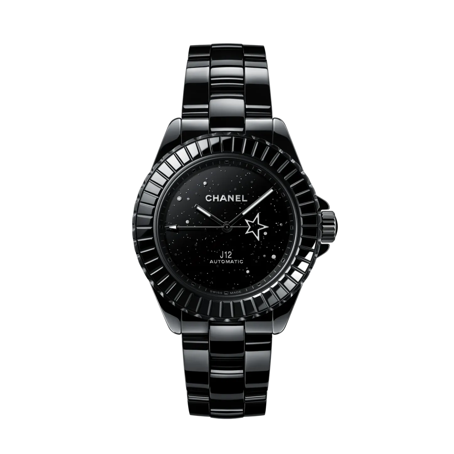 Steel with matte black coating fixed bezel with black-varnished sapphire crystal with baguette-cut pattern
