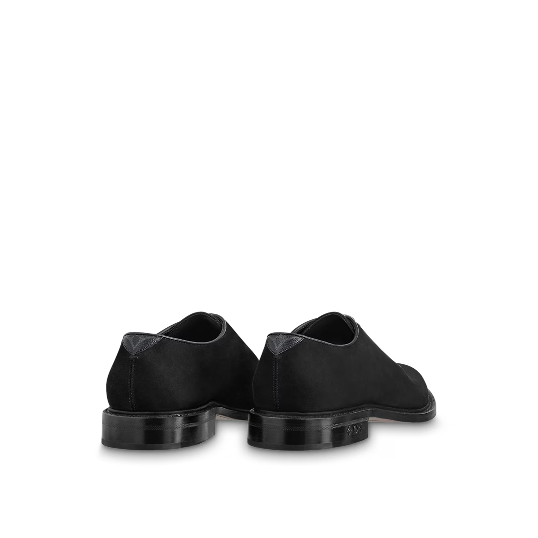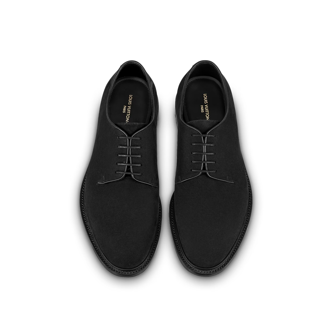 LV Flex derby offers an innovative twist on a classic style with its Goodyear Flex construction, which integrates a cork filling into a traditional construction to provide the comfort of a sneaker. The upper is crafted from velvety nubuck calf leather, trimmed at the back with Monogram canvas. Three Monogram Flowers decorate the heel.