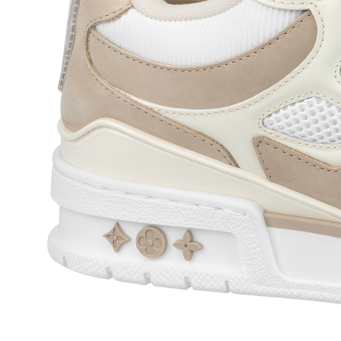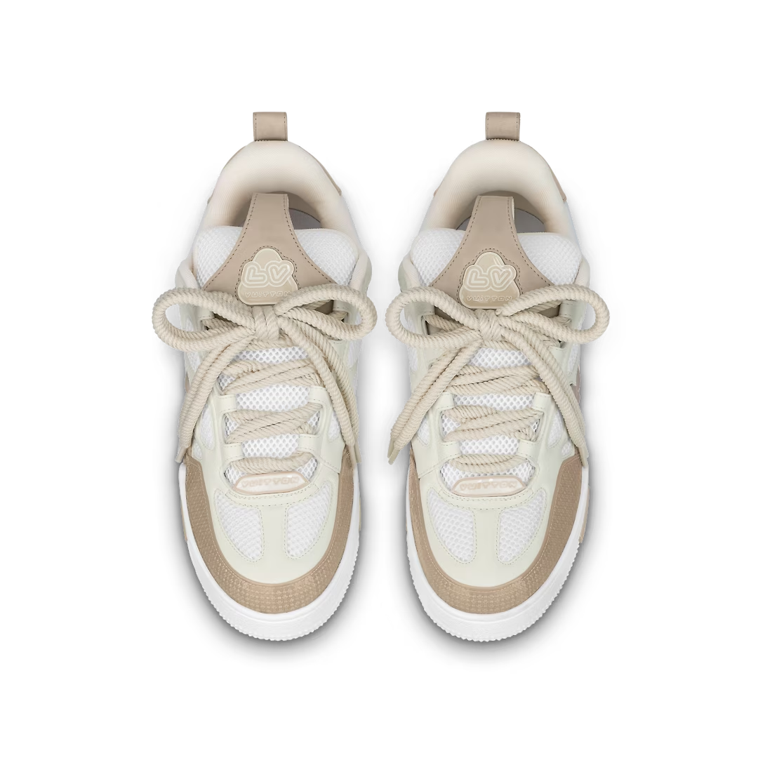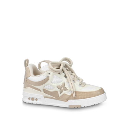 The LV Skate sneaker references a Nineties-inspired design first seen at Louis Vuitton's Fall-Winter 2022 men's show. Its elaborate, bicolor upper with Monogram Flower detailing combines technical mesh, calf leather and suede. This model is notable for its padded collar, technical double laces and bicolor rubber outsole decorated with Monogram Flowers.