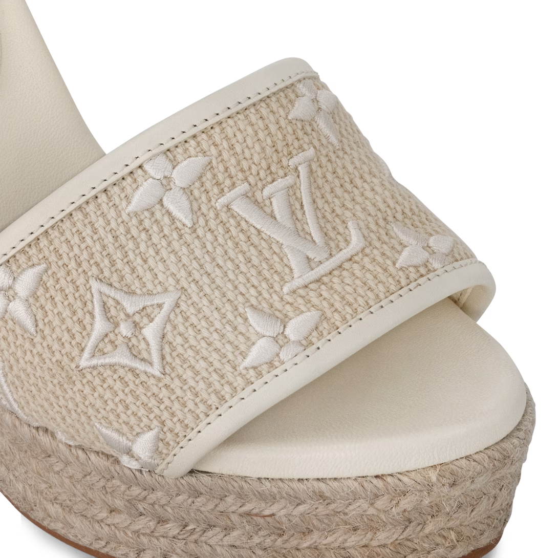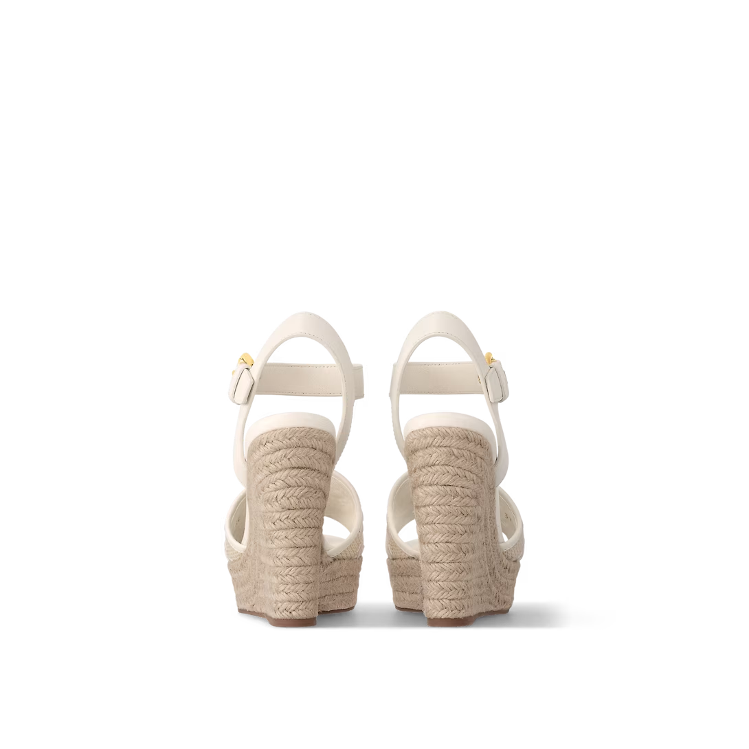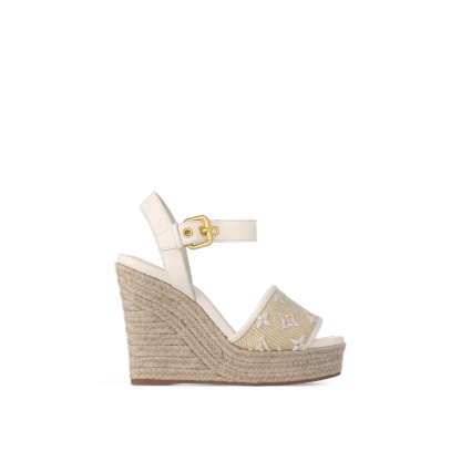 The Starboard wedge sandal features a front strap in Monogram-embroidered cotton, matching the season's leather goods collection. This relaxed model has a comfortable wedge sole, which is covered in braided rope, referencing the classic espadrille. Its calf-leather strap is adjusted around the ankle with an engraved, gold-tone buckle.
