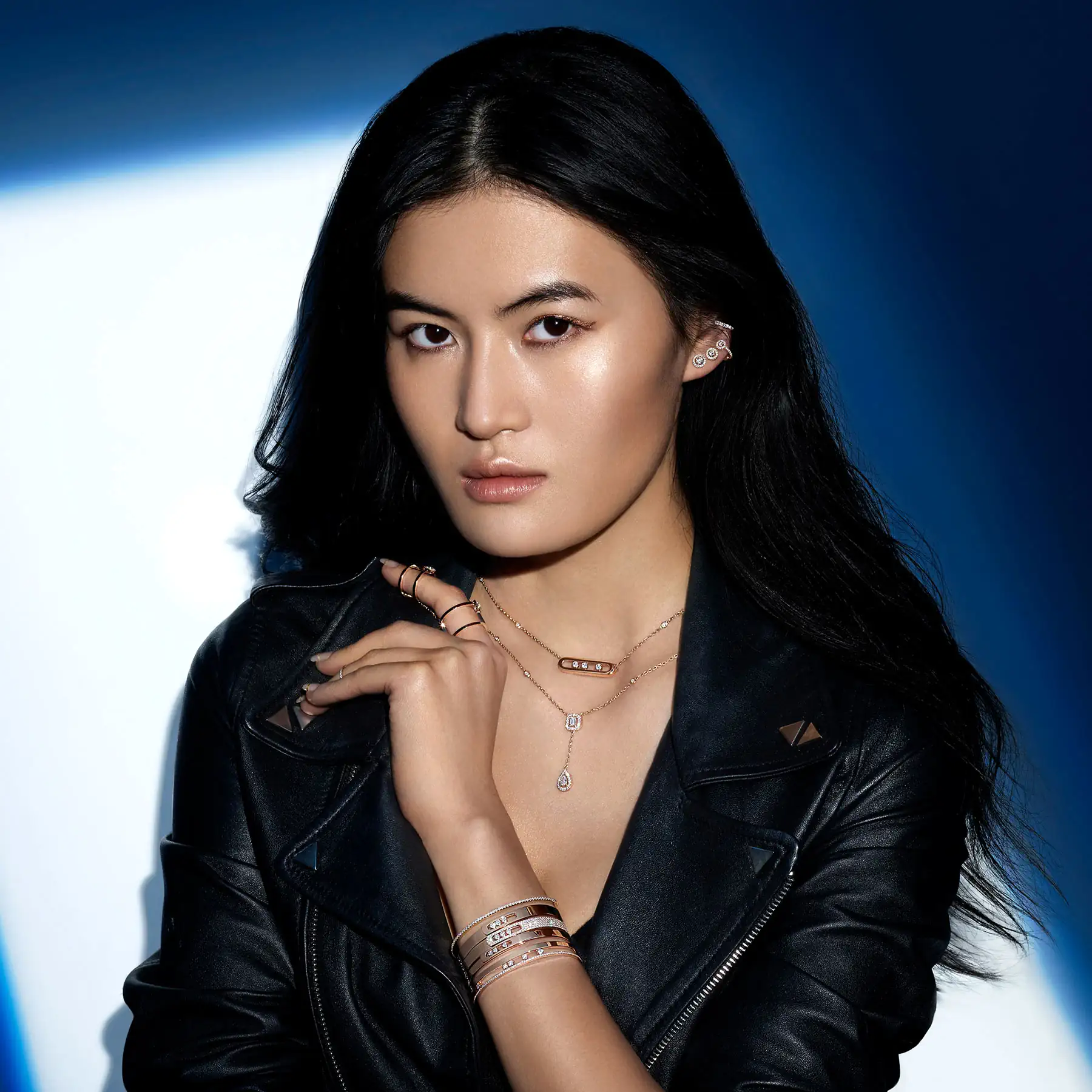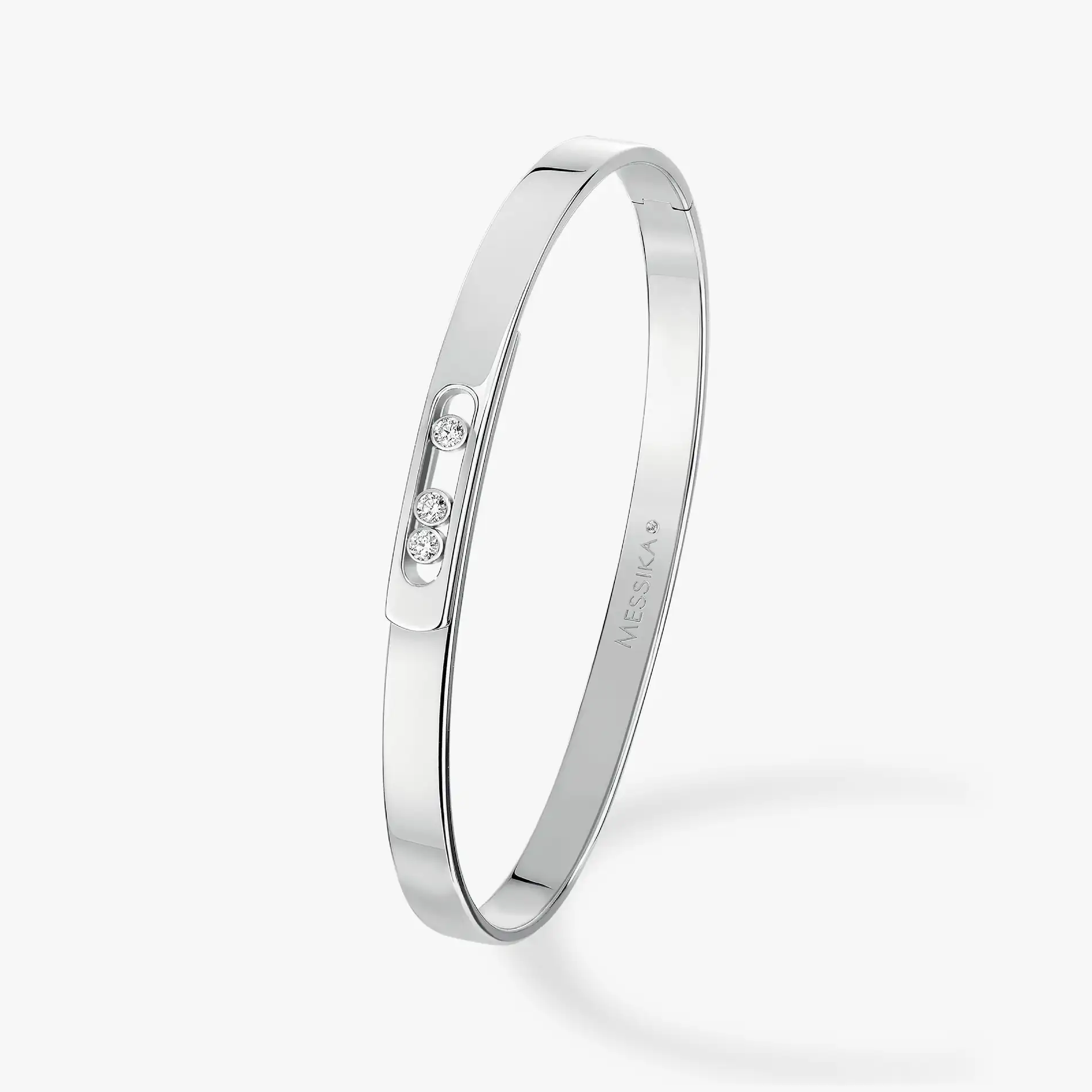 With a refined design to better fit the curves of the wrist, the Move Noa PM white gold diamond bangle bracelet has been reinvented, all the while staying true to itself. The clean lines of the wider version were a hit, but this new, sleeker model is just irresistible, and is even better for stacking with other pieces. This handmade white gold diamond bangle bracelet for women features three diamonds, the perfect symbol of everlasting love. Let be seduced by this diamond cuff bracelet for women, a diamond jewel that will become a go-to accessory.