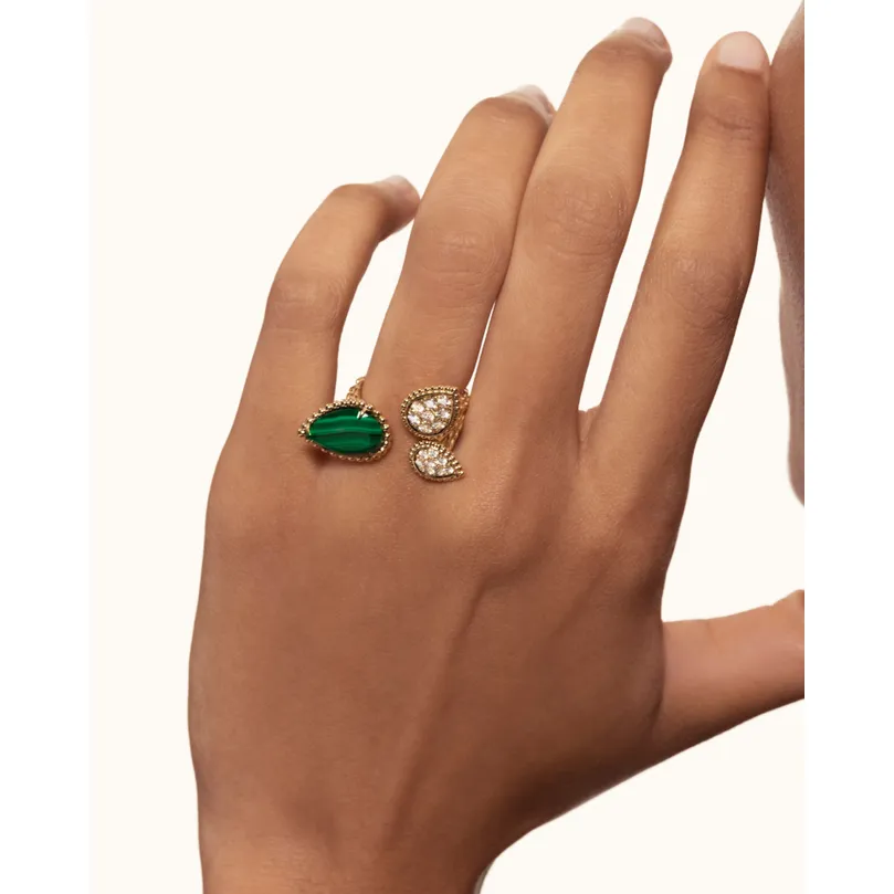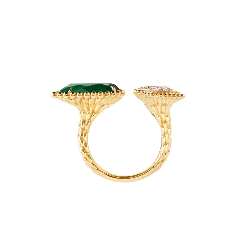 Contrasting yellow gold and malachite enhance the femininity of this triple-motif Serpent Bohème ring. It is said to have protective virtues. Is that why you are choosing it?