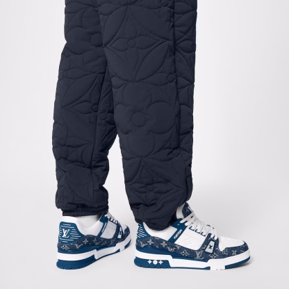 Designed by Louis Vuitton Artistic Director Virgil Abloh, the iconic LV Trainers are revisited this season in Monogram denim and Monogram-embossed grained calf leather. The contrasting colours and materials highlight the elaborate construction of this model, which was inspired by vintage basketball trainers. A single pair takes seven hours to stitch.