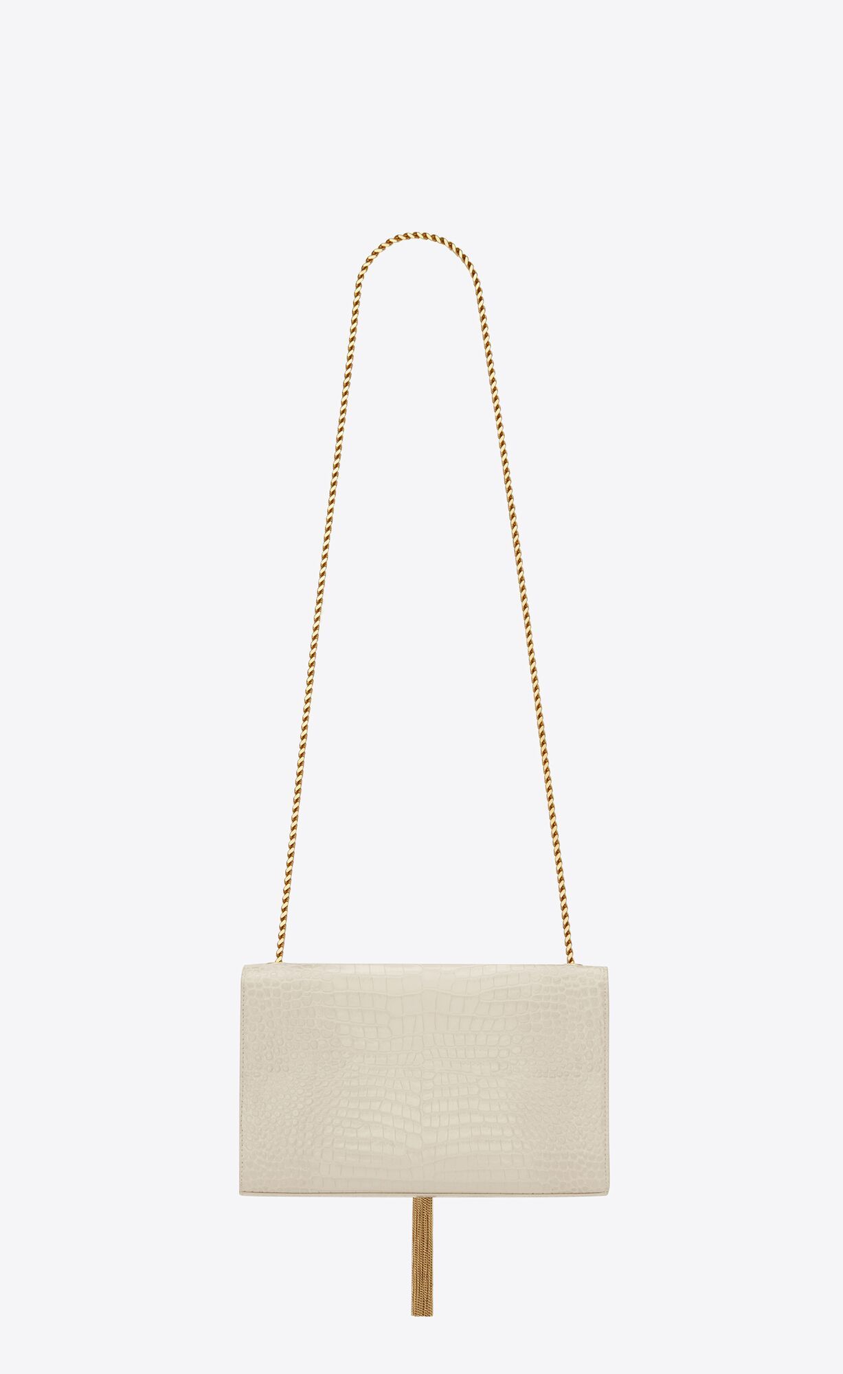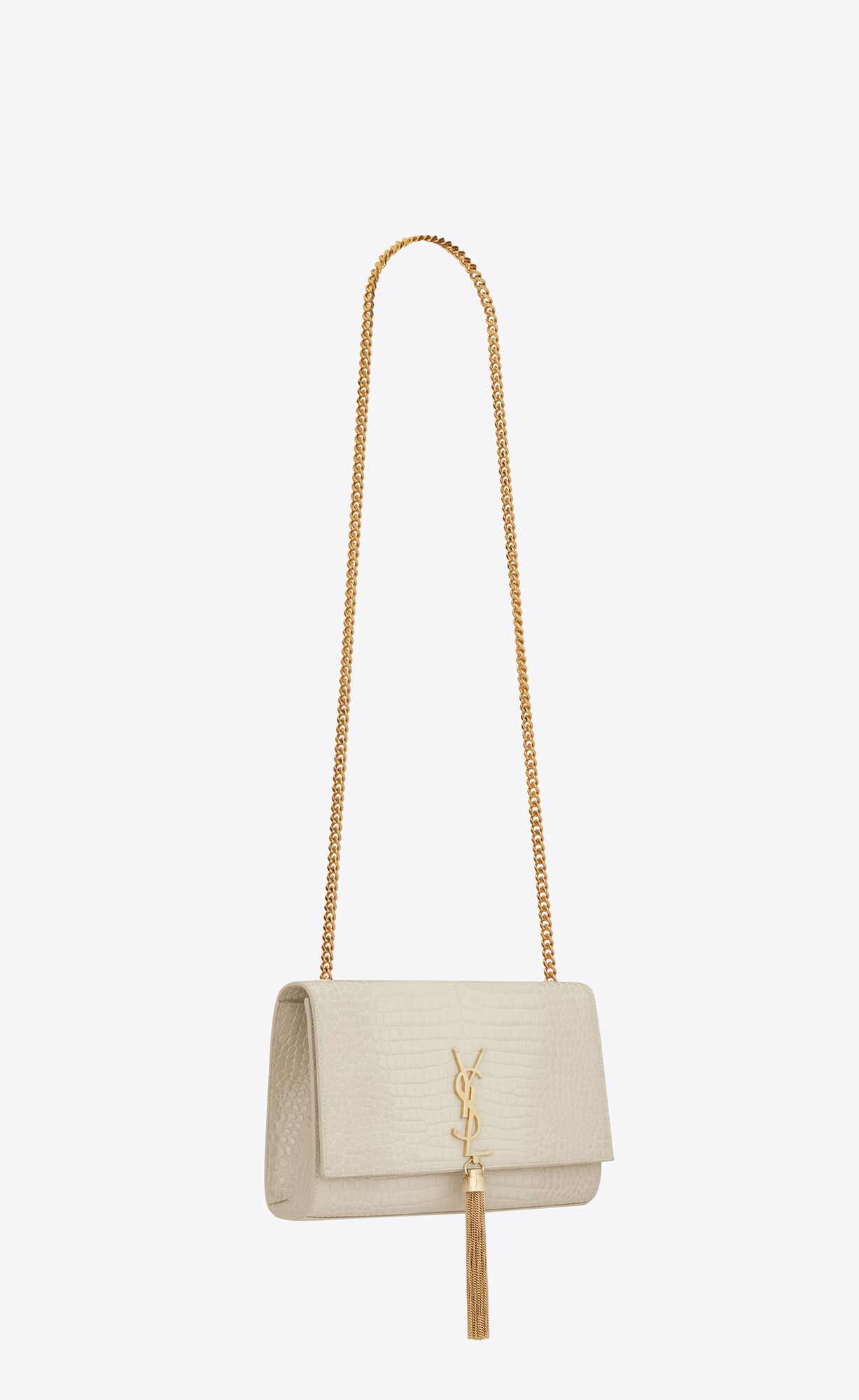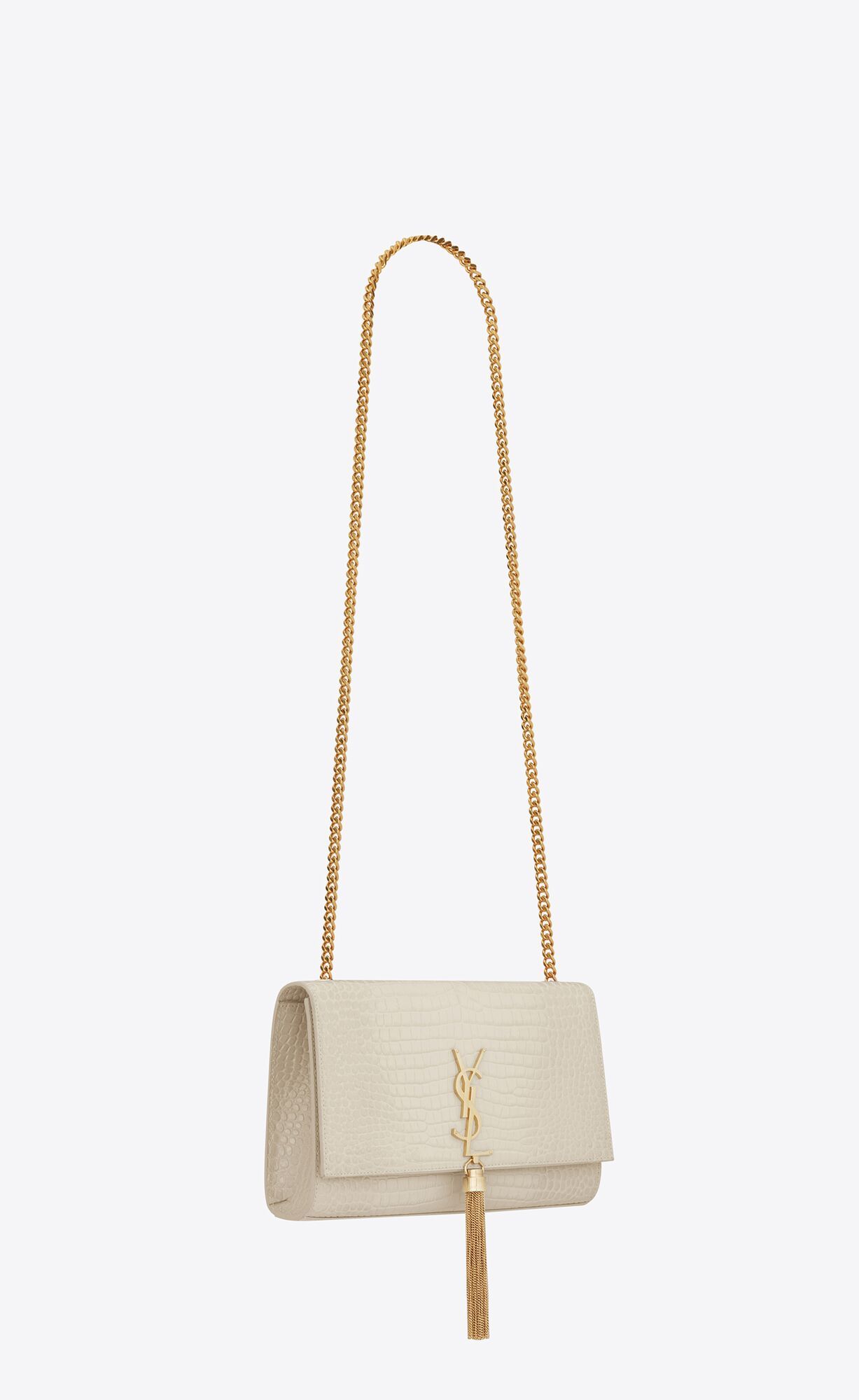 THE ICONIC KATE BAG IN SHINY CROCODILE-EMBOSSED LEATHER, FEATURING THE CASSANDRE AND CHAIN TASSEL.