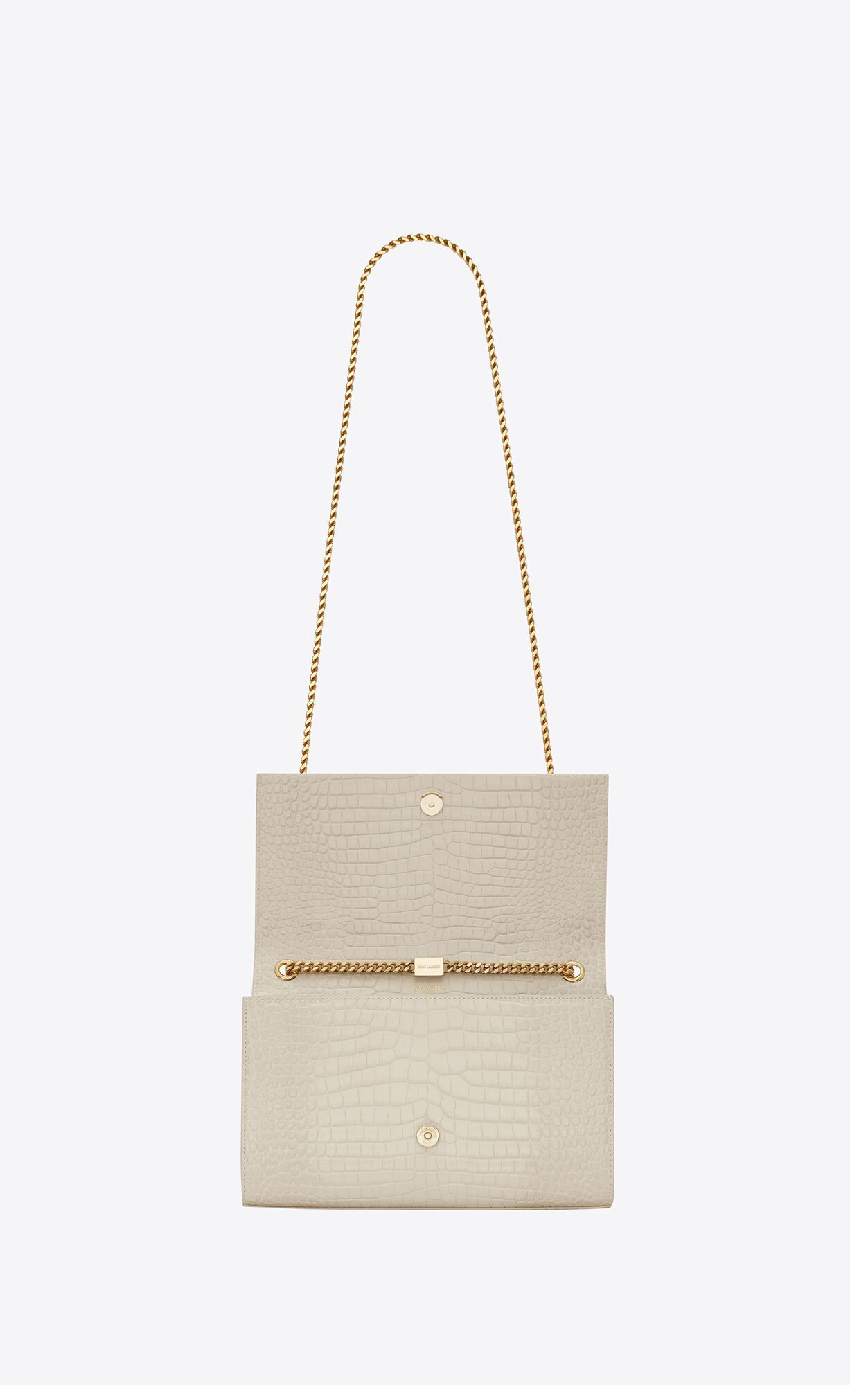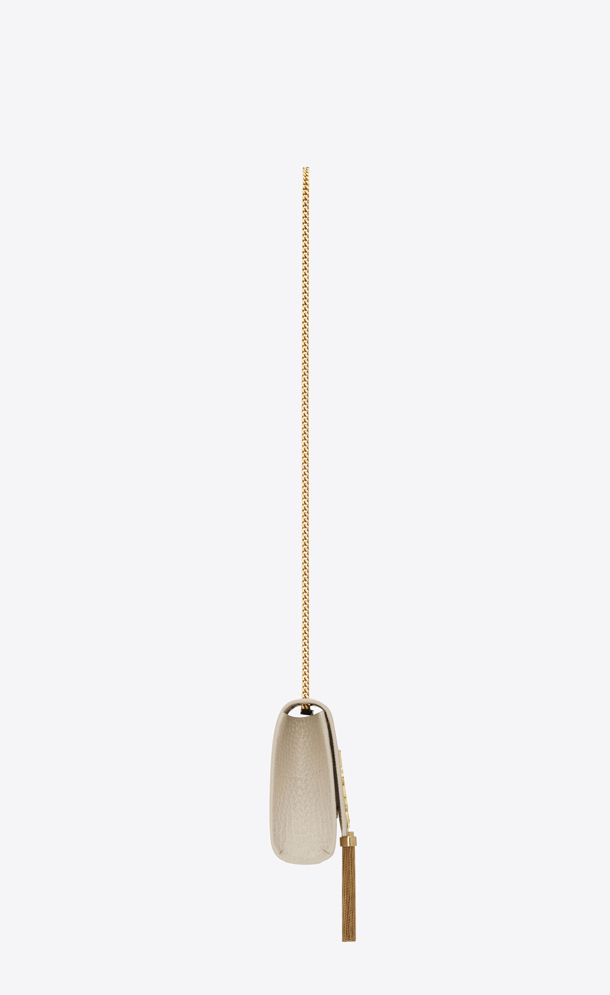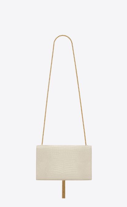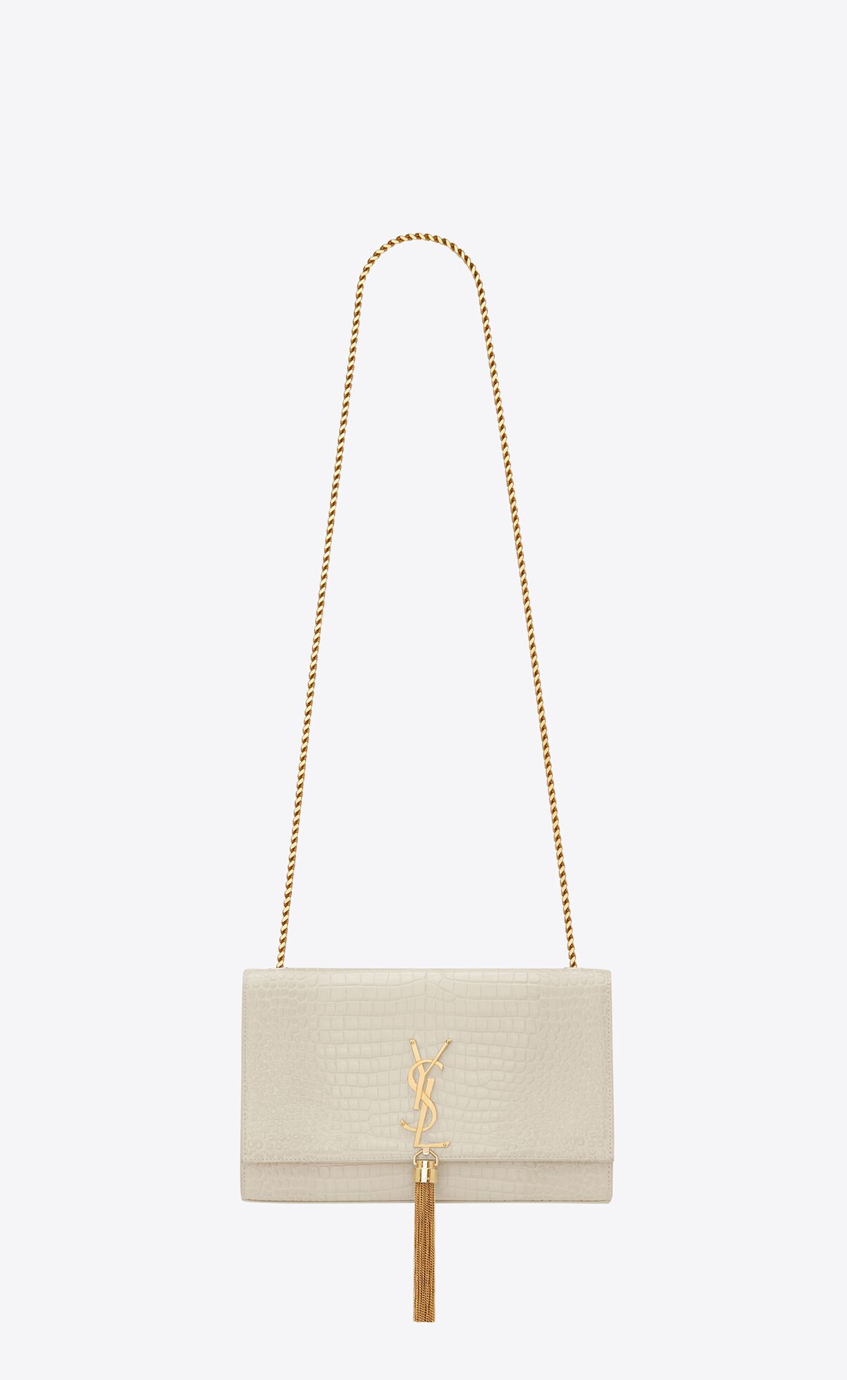 THE ICONIC KATE BAG IN SHINY CROCODILE-EMBOSSED LEATHER, FEATURING THE CASSANDRE AND CHAIN TASSEL.